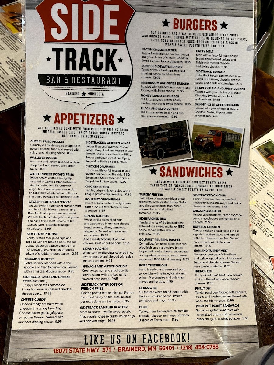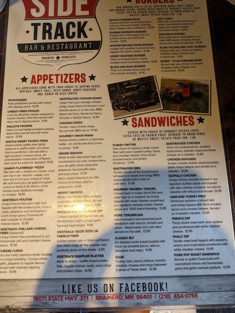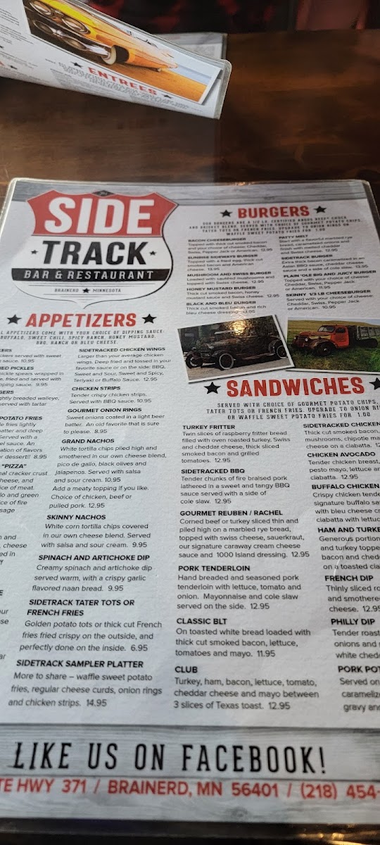 Welcome to The Side Track Bar and Restaurant, a hidden gem located in the heart of Brainerd, MN. Renowned for its classic rural bar and restaurant vibe, it offers an inviting atmosphere that beckons locals and travelers alike. The menu features a delightful array of options, from delectable breakfast omelets served with crispy hash browns to hearty lunches, including the standout Backtrack Chicken topped with wild rice soup.